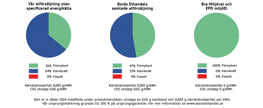 Som elhandelsföretag ligger det oss varmt om hjärtat att värna om miljön. All el som vi köper in är fossilfri och produktionen sker främst i vatten-, vind- och kärnkraftverk, men en liten del av elen kommer även från lokalproducerad solenergi. Som kund hos Borås Elhandel får du med automatik en mix av fossilfria energikällor i ditt elavtal. Den el vi sålde 2023 medförde under produktionsfasen utsläpp av 0,03 g koldioxid och 0,002 g kärnbränsleavfall per kWh. Vår ursprungsmärkning grundas till 100% på ursprungsgarantier.